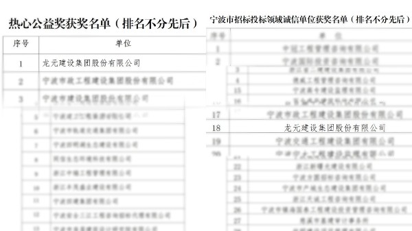 為推進寧波市招標投標領域信用體系建設,規范招標投標當事人行為,提高招標投標單位的誠信意識,推廣和弘揚先進。近日,寧波市招標投標協會公布了2021—2022年度寧波市招標投標領域誠信單位評選結果,龍元建設集團榜上有名。同時,集團公司還獲得寧波市招標投標協會2022年度熱心公益獎。