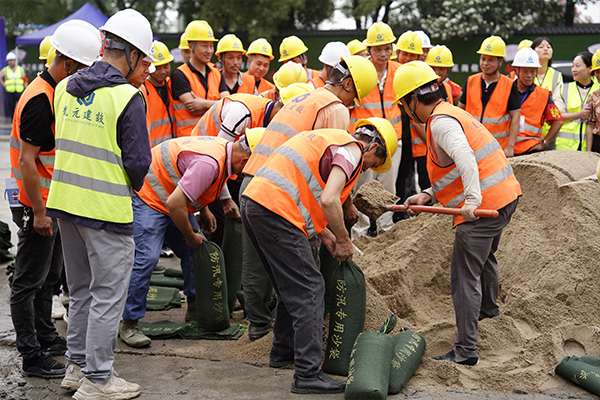 本次應(yīng)急演練活動(dòng)分為防汛排澇應(yīng)急演練比武和消防滅火應(yīng)急演練兩部分。防汛排澇應(yīng)急演練比武內(nèi)容為在兩地塊的車庫坡道口分別堆筑50厘米高度的阻洪堤,利用抽水設(shè)備進(jìn)行排澇,用時(shí)最短的即為優(yōu)勝隊(duì)伍。六支參賽隊(duì)伍齊心協(xié)力,裝沙包、運(yùn)沙包、堆沙包、排澇......現(xiàn)場(chǎng)加油和沖刺聲此起彼伏。